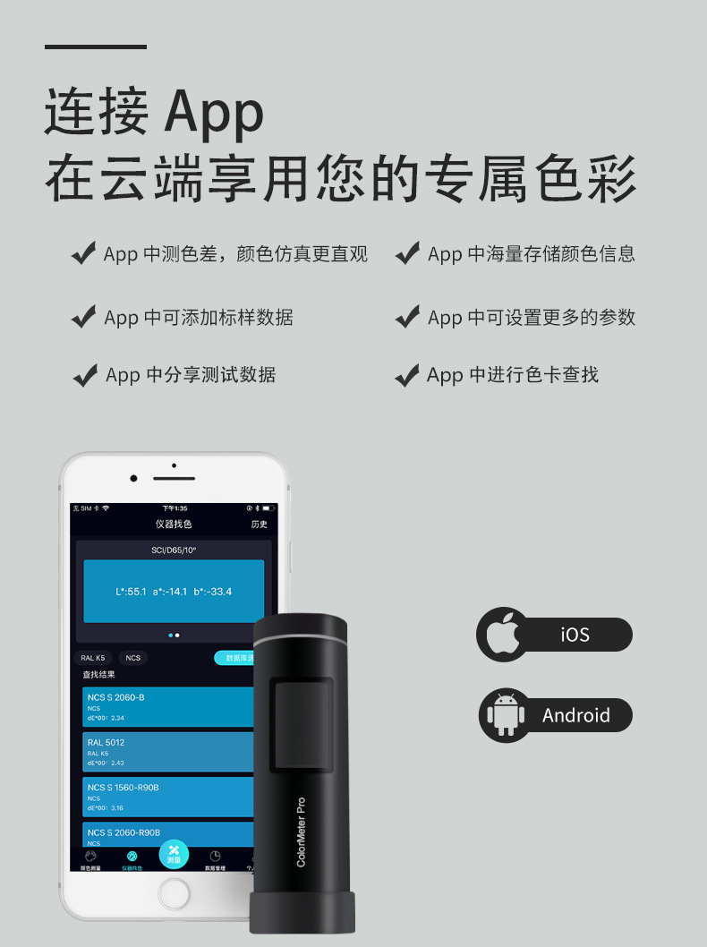 色差寶ColorMeter Pro是一款不同以往的顏色工具,強(qiáng)大的性能配置,讓色彩測量更專業(yè);與安卓或IOS設(shè)備無線連接,極大的拓展了顏色測量儀器的應(yīng)用邊界;它將帶您進(jìn)入色彩管理新世界,可替代印刷、涂料、紡織等色卡,實現(xiàn)顏色讀取、色卡查找功能。