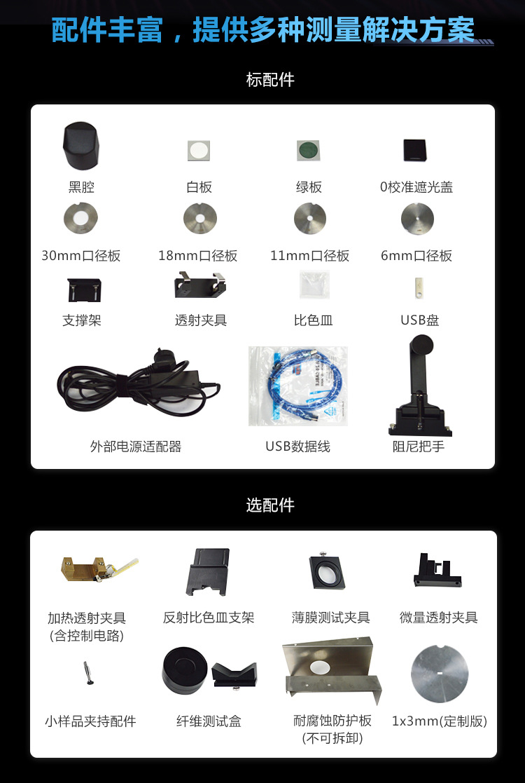 加熱透射夾具(含控制電路)、立式支架、氣動頂桿(含控制電路)、小樣品夾持配件、反射比色皿支架耐腐蝕防護板(不可拆卸)、纖維測試盒、薄膜夾具、微量透射夾具、拉桿箱、歐標(biāo)插頭、美標(biāo)插頭