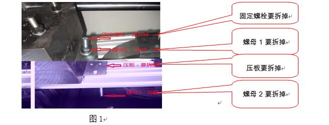 ⑴ 卸下固定螺母1后,把平墊和彈簧墊取下→⑵取下壓板→⑶松開螺母2→⑷擰下固定螺栓。