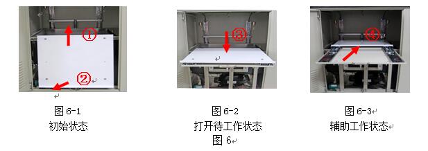 在圖6中的圖6-1初始狀態(tài)下,在標志①處整體往上拉,使活動托板的下端往上抬高,同時在②處往外拉,直到活動托板處于水平位置,圖6-2中顯示的③打開待工作狀態(tài)。