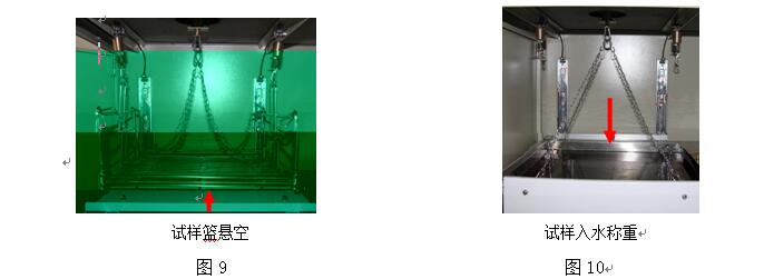 ⑵ 推動上活動托板,讓車轍試件置于電子天平正下方,將方形網(wǎng)籃上的2個帶不銹鋼鏈子的S形掛鉤掛在電子天平下方的保險掛鉤上,見圖8。