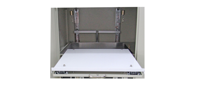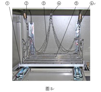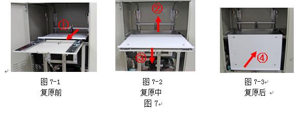 試驗完成后,一般可把活動托板處于打開待工作狀態(tài),如果儀器長期不用而需要關閉前門,需要將活動托板復原到初始位置,方法如下。