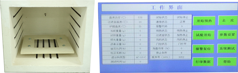 ⑹ 裝好混合料后,如果此時“過濾室溫度”顯示大于600度時,將料筐放在燃燒爐內(nèi)的托盤上,一定要將料筐放置在托盤的中央,才能確保試驗結(jié)果的準(zhǔn)確性。